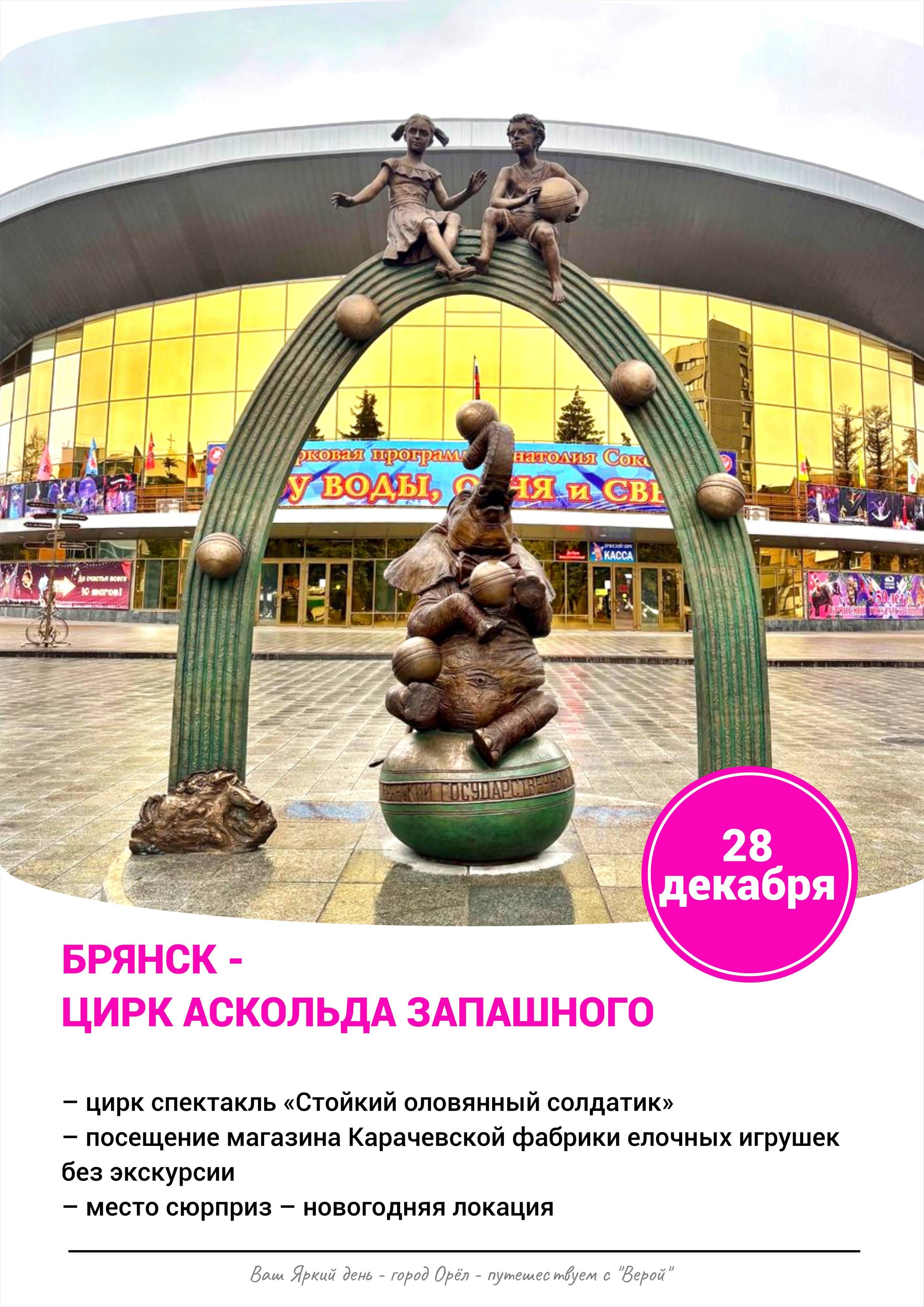 28 декабря – Брянск - цирк Аскольда Запашного - спектакль «Стойкий оловянный солдатик» + магазин Карачевской фабрики елочных игрушек + место сюрприз. Зарядитесь позитивом и новогодним настроением.